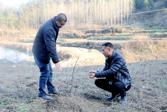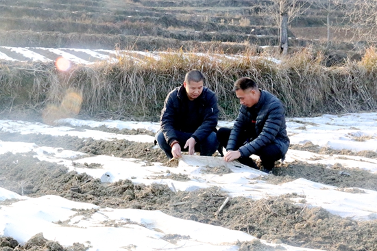 洪军(右)在魔芋基地查看地膜防冻情况,山前山后都是产业基地