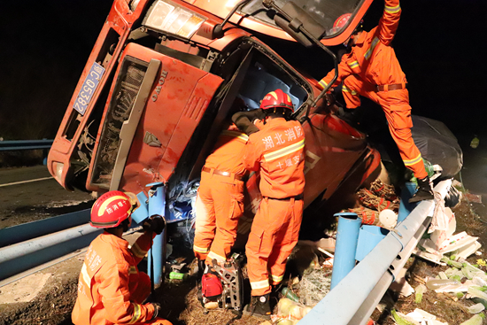 消防救援人员到达现场时,交警部门已到达现场进行秩序维护。经现场勘查,一辆满载蔬菜的大型货车侧翻匝道口,地面上全是玻璃碎片和车辆零件,驾驶员被困车内动弹不得,因被困太久,脚已麻木,加之深夜,气温在零下4摄氏度,如不及时救援,后果十分严重。根据现场情况,现场指挥员立即制定了救援方案,首先把扭曲的零部件和玻璃碎片从驾驶室内清除,再用液压破拆工具组对驾驶室进行扩张;在救援的同时对被困者进行安抚。经过20余分钟的紧张救援,驾驶员成功脱困,并抬上120救护车送往医院救治。