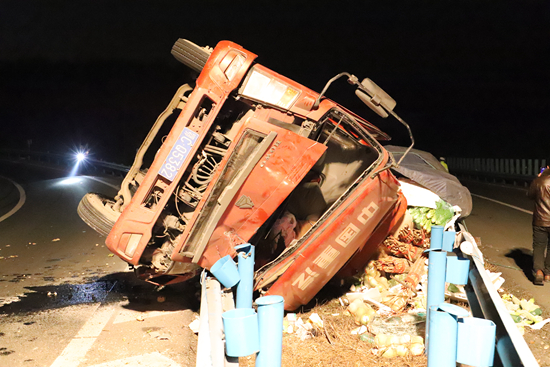 事后经询问了解,货车在运送蔬菜的途中,过弯道时由于车速过快,车辆失控,撞至护栏发生侧翻。