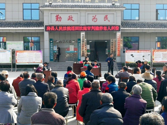 房县人民法院军店法庭受案后,通过详细调查,在调解无果的情况下,军店镇巡回法庭决定在原告所在地中村村进行公开审判。在长达3个小时庭审中,双方对簿公堂,通过举证、辩答、合议最终达成了赡养调解协议。