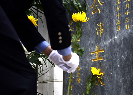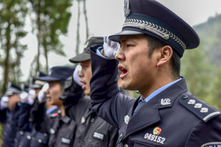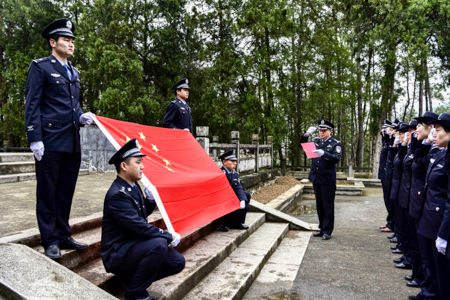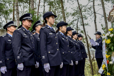 在陈士欣烈士墓前,民警静静的站在烈士墓前,为烈士默哀,缓步上前敬献花篮,静静聆听烈士生平,将手中黄色的菊花敬献在英烈墓碑,以寄托哀思,缅怀先烈。