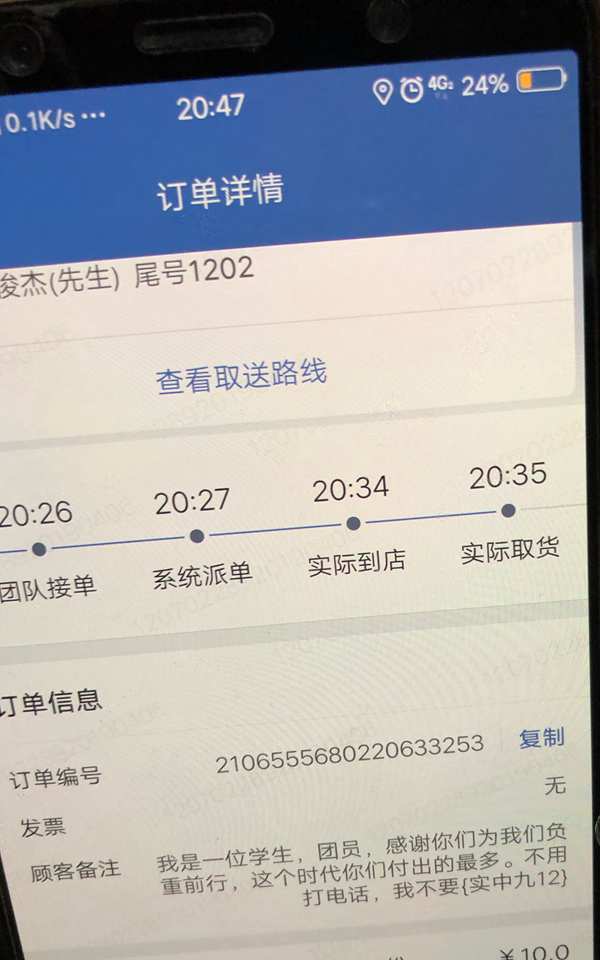 6日晚,一名外卖小哥来到县消防中队门口,将一包热乎乎的奶茶交给执勤战士。从外卖小哥的订单上得知,是一名学生送来的祝福。外卖运单上备注:“一名学生团员,感谢你们为我们负重前行,这个时代你们付出的最多。”