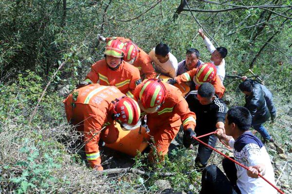 事发地点距离房县县城约50公里,消防救援人员到达事故现场时,当地群众和青峰镇上的医疗救护人员已经下到山崖下方将两名伤者从车内救出,由于山崖过于陡峭无法将伤员运送至救护车上,消防救援人员利用道路护栏作支点,铺设一条120余米的绳索,受伤较轻的司机由救援人员采取背、抬的方式进行转移,受伤较重的随车人员则利用多功能救援担架进行固定后转移。经过约70分钟的紧张救援,两名伤者被成功救出送往医院进行治疗。