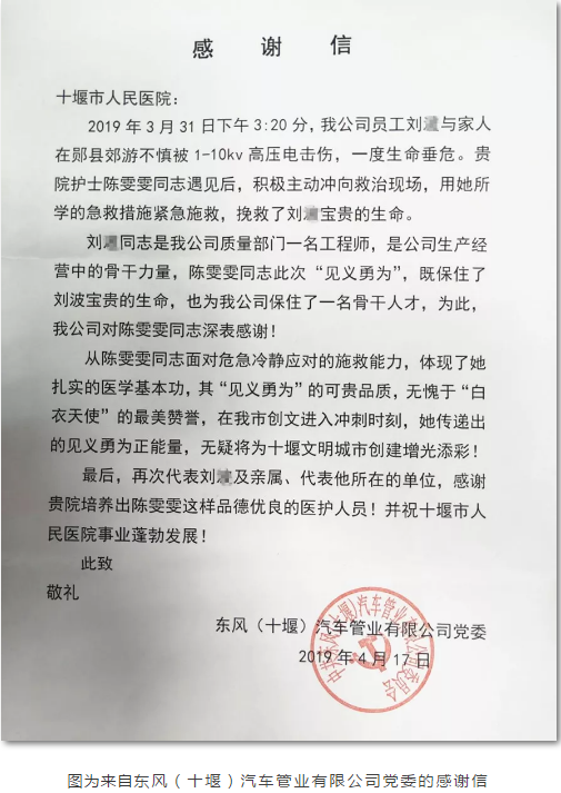 “贵院陈雯雯同志面对危机冷静应对的施救能力,体现了扎实的医学基本功。其见义勇为的可贵品质,无愧于白衣天使的最美赞誉。在我市创文进入创文冲刺时刻,她传递出的见义勇为正能量,无疑将为十堰文明城市创建增光添彩。”4月19日,十堰市人民医院收到来自东风(十堰)汽车管业有限公司党委的一封特殊的感谢信。