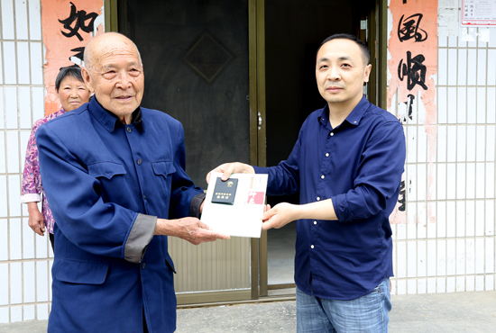 今日房县网讯 记者高书文 报道: 5月25日,门古寺镇狮子岩村96岁老人张发祥,在家门口接过由县作家协会主席西域为其颁发的房县作家协会会员证书,成为房县作协年龄最大的新成员。张发祥表示,要在无限好的夕阳岁月里,写出更多更好的充满正能量的文学作品来。