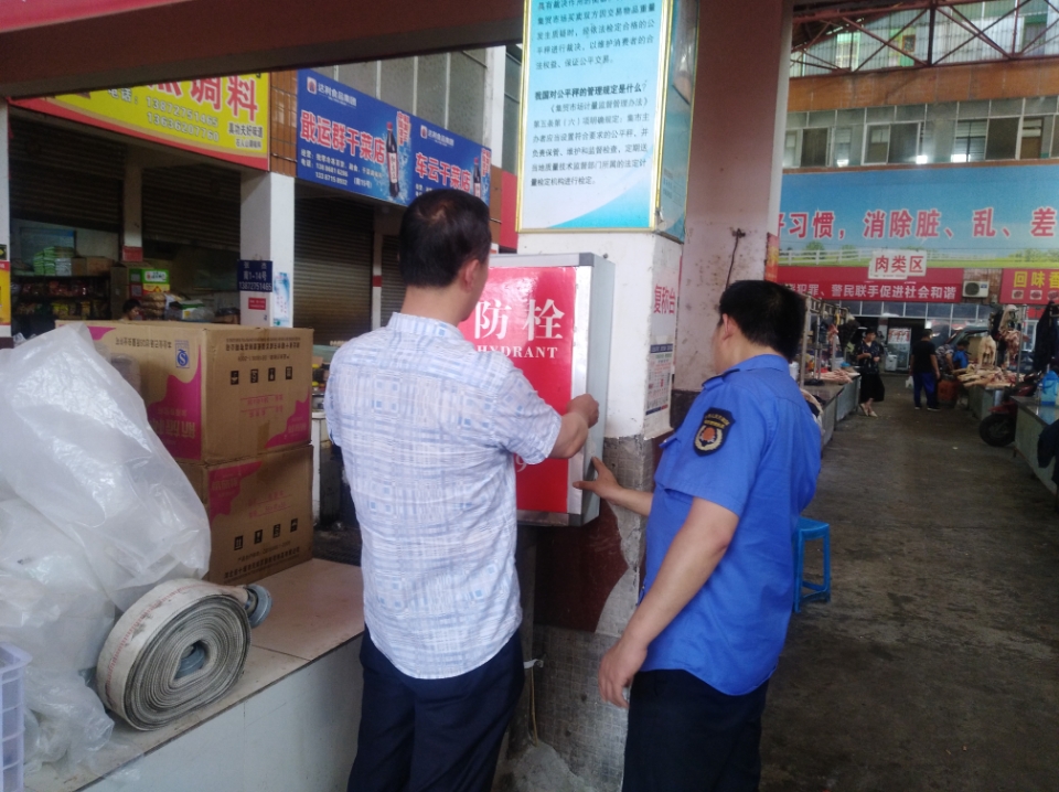 检查过程中,重点对农贸市场的安全出口.疏散通道是否畅通,疏散指示标志是否符合要求,消防器材设施是否配备齐全完整好用,消防安全管理制度,应急预案是否落实,是否组织开展隐患自查自整,消防演练和员工消防安全教育培训工作等情况。
