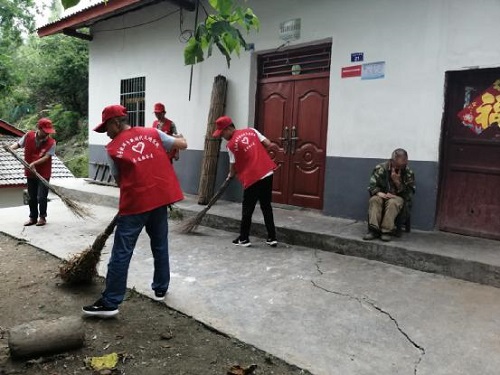 2019年6月19日,西坡村两委干部和驻村工作队(房县联通公司)组成的新时代文明实践志愿者服务小队,在西坡村开展人居环境整治暨清洁庭院活动,志愿者们身着红马甲,入户与村民面对面沟通交流,引导村民积极参与到全村的环境整治工作中来,督导清理好排水沟、扫除房前屋后的垃圾,码整齐房前屋后的柴堆等杂物。随后,志愿者们帮助残疾人刘安福家、张开平家打扫卫生。