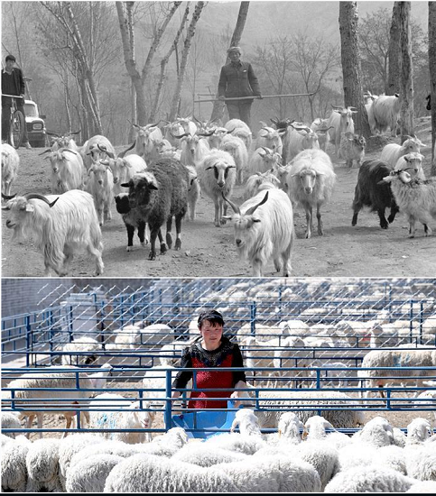 这是一张拼版照片,上图为1993年4月27日,陕西省延安市梁村乡的白生有老汉在放养自家的羊群(新华社记者陶明摄);下图为2019年4月23日,延安市安塞区化子坪镇河西沟湖羊养殖场的工作人员在喂羊(新华社记者刘潇摄)。新华社发