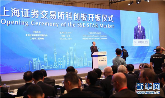 6月13日,上海证券交易所科创板开板仪式在陆家嘴论坛上举行。这是中国***主席易会满在开板仪式上致辞。新华社记者方喆摄
