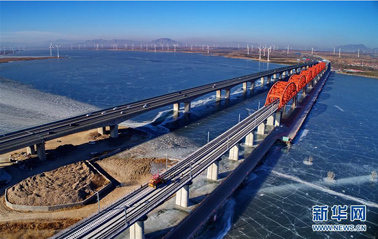 中铁三局工人在河北张家口京张高铁官厅水库特大桥进行铺轨作业(1月13日无人机拍摄)。新华社记者杨世尧摄
