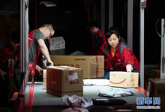 工人在位于西安的京东智能物流中心细分区龙门架下整理包裹(6月3日摄)。龙门架扫描后,包裹的出库物流信息将自动更新。新华社记者邵瑞摄