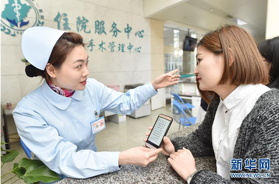 在福建医科大学附属第一医院,护士引导患者凭出院结算短信直接到住院收费处领取发票和余款,大大简化出院手续,实现医保结算“零等待”(2018年3月22日摄)。新华社记者宋为伟摄