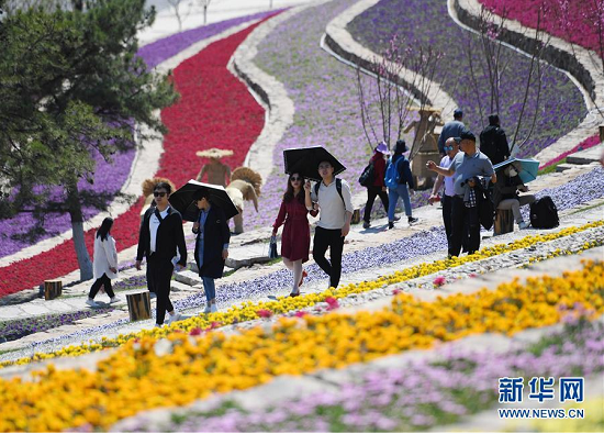 游客在北京世园会天田山游玩(5月1日摄)。新华社记者张晨霖摄