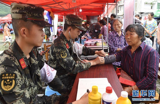 在四川长宁地震灾区安置点,武警宜宾支队卫生队党小组成员为群众提供医疗服务(6月20日摄)。新华社记者刘坤摄