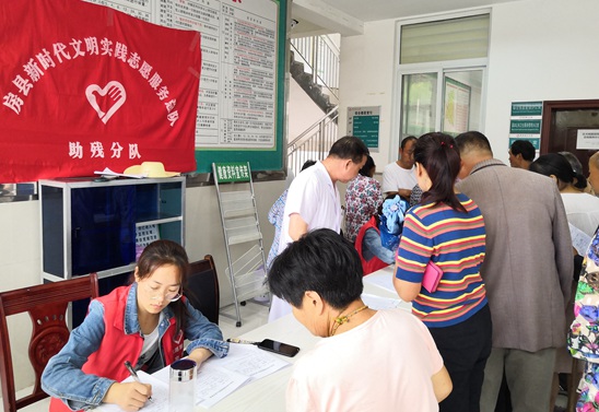 一大早,各村工作队安排专人负责上门接送残疾群众,确保残疾群体按时顺利到达办证现场。县残联工作人员现场宣传残疾人相关政策,解读办证流程,窑淮镇新时代文明实践志愿者帮助他们填写申请表,然后由专家现场鉴定。