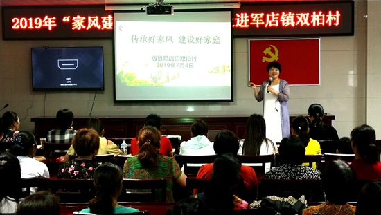 今日房县网讯 通讯员 刘智宝 报道: 7月8日,《房县妇联2019年“家风建设助脱贫”巡讲活动》走进军店镇双柏村。县妇联主席段爽、县妇联副主席张航、军店镇妇联主席李明琴等领导参加了本次活动。家风建设讲师向淑媛、县检察院检查官时建文、县妇幼保健院医生庄海燕分别以“传承好家风,建设好家庭”为主题的家庭教育、未成年人相关的法律知识安全常识(包括防溺水、防校园欺凌、防性侵等)和女性健康知识进行了宣讲。