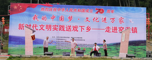 上午9 点整,文艺演出在欢快热情的广场舞《点赞新时代》中拉开序幕。歌伴舞《六口茶》用生动形象的动作和表情展现了青年男女向往美好生活的境界;快板舞《人情歪风讨人厌》以倡导“崇简尚俭、婚事新办、丧事简办、小事不办”的人情新风为主题;小戏《特殊待遇》将整场演出推向高潮。《特殊待遇》主要讲叙精准扶贫驻村第一书记帮扶贫困户的故事。节目旨在补齐精神短板,矫正当前部分群众争当贫困户的错误价值取向,引导贫困群众以主人翁态度和昂扬的斗志,用勤劳双手创造美好生活。节目结合当前形势,把鲜活的脱贫故事形象地展现在舞台上,坚定了群众脱贫致富的信心和决心,助推脱贫攻坚工作顺利开展。