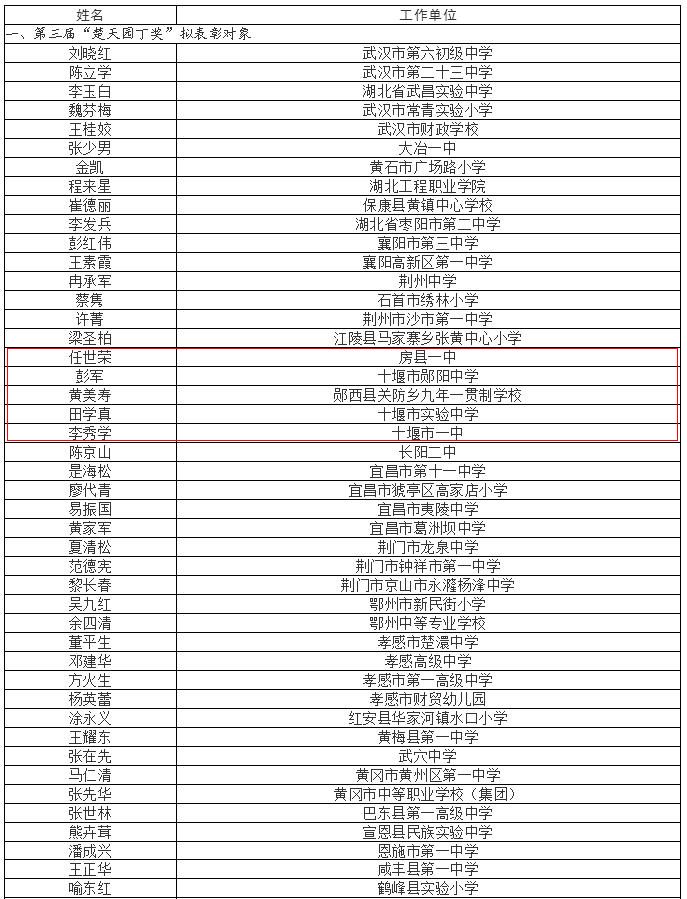 根据《省人力资源和社会保障厅 省教育厅关于做好第三届“楚天园丁奖”、湖北省农村先进教师和先进教育工作者评选表彰工作的通知》(鄂人社奖〔2019〕22号)精神,在各市州、有关学校逐级审核推荐的基础上,经省评选表彰工作领导小组评审,初步确定刘晓红等80名同志为第三届“楚天园丁奖”拟表彰对象、张春莉等40名同志为湖北省农村先进教师拟表彰对象、何晓芳等10名同志为湖北省先进教育工作者拟表彰对象。为体现公开、公正、公平原则,充分发扬民主,现将上述推荐对象予以公示,公示期为8月20日至8月26日。