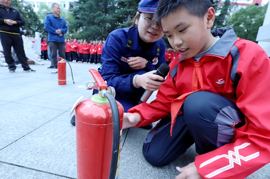 最后,大队宣传员就灭火器的使用、检查方法进行细致讲解,在宣传人员的正确引导下,部分学生代表还亲自上阵使用灭火器进行“灭火”。