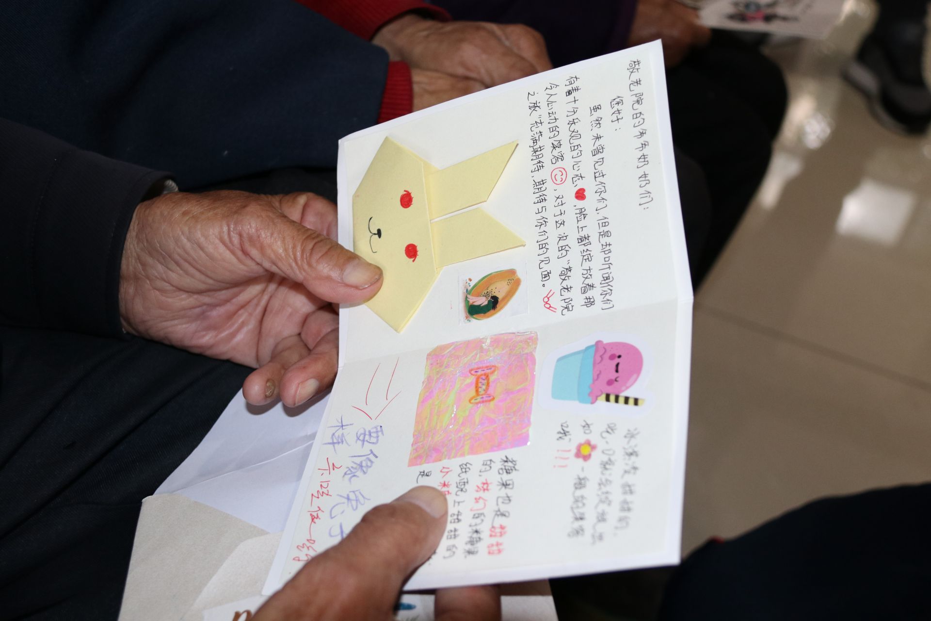 活动中,志愿者们将亲手制作的贺卡一一送到老人们的手中,并把贺卡上的祝福语读给老人们听。老人拉着志愿者的手,和志愿者们一起聊生活中的事。在志愿者们的询问下,老人开始讲述他们的人生经历,身体状况等。