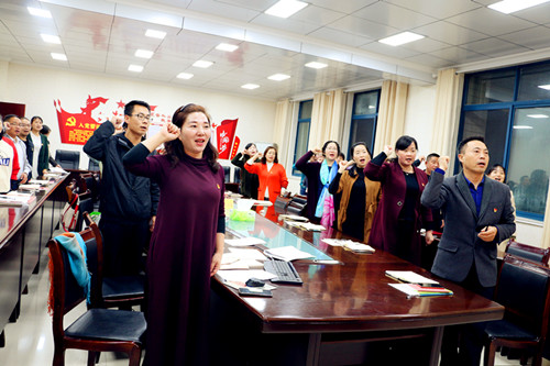 活动在高昂的国歌声中拉开了序幕。活动中,首先由分管党建工作的郑先艳带领大家开头引读,每人一段接力,党员们表情严肃,声音铿锵有力,充分表达了对党章的尊崇和敬畏之心。诵读完毕,全体党员面对鲜红的党旗,庄严地高举右拳,郑重宣誓,重温自己对党忠诚的誓言:“我志愿加入中国共产党,拥护党的纲领,遵守党的章程……”通过诵读和宣誓,再次坚定了党员同志们对党的坚定信仰,进一步加深大家对党的性质、宗旨、指导思想、奋斗目标的理解,更加明确要坚持把党章作为日常行为根本准则,以党章为参照自警自省,严格执行党的决定。再次提醒每个党员要始终牢记作为一名共产党人的权利和义务,进一步增强了党员的组织观念,提升了党员的凝聚力和向心力。