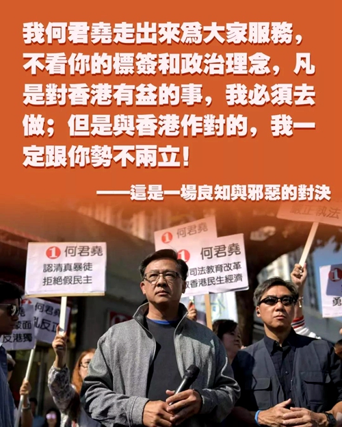 支持建设力量,维护正常选举秩序。何君尧遇刺后,许多正义人士大声呼吁“还区选免于恐惧的自由”。的确,在法律限度内,民主选举应保障参选者表达观点、公平竞争的权利。如果因为站在建制立场、发出正义呼声就要惨遭毒手,参选者的人身安全、区议会选举的公正性与安全性就得不到保证。反对派拒绝谴责暴力、纵暴煽暴的行为,恰恰是为了让建设力量“知难而退”、让助选市民人人自危,从而在选举中顺利“收割”成果。在这个意义上说,何君尧不畏、不悔、不退,带着尚未完全痊愈的刀伤,第一时间走上“战场”,起到了鼓舞建设力量的标杆作用,也是净化选举环境的可贵努力。