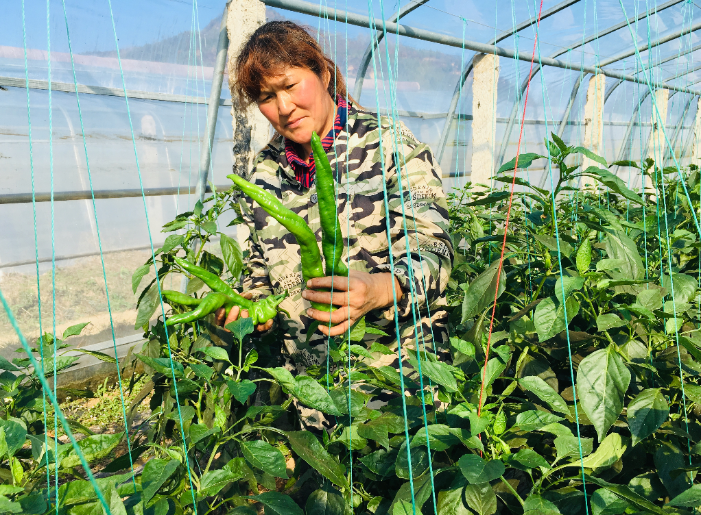 上营村村民李发翠正在蔬菜基地采摘螺丝椒