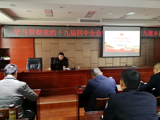 宣讲结束后,九道乡党委副书记、乡长王瑞强调,我们要以此次宣讲为契机,不断加深理论学习,在全乡形成长期学、自觉学的学习风气;坚定四个自信不动摇、不偏离、不变道;提高政治站位,提定力,炼能力,敢担当;全乡要准确把握全会精神,结合九道乡工作实际,开展好工作,真正把十九届四中全会精神融入到工作中。