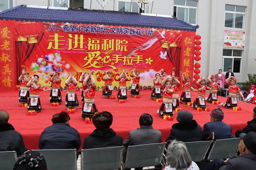 活动当天,由八一希望小学师生志愿者和白路社区志愿者组成的200多人的慰问团队来到福利院。他们的到来,使原本冷清的福利院变得热闹起来。八一希望小学志愿者们首先为孤寡老人们带来了一场精彩的文艺演出。