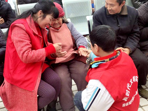 志愿者们给老人修剪指甲