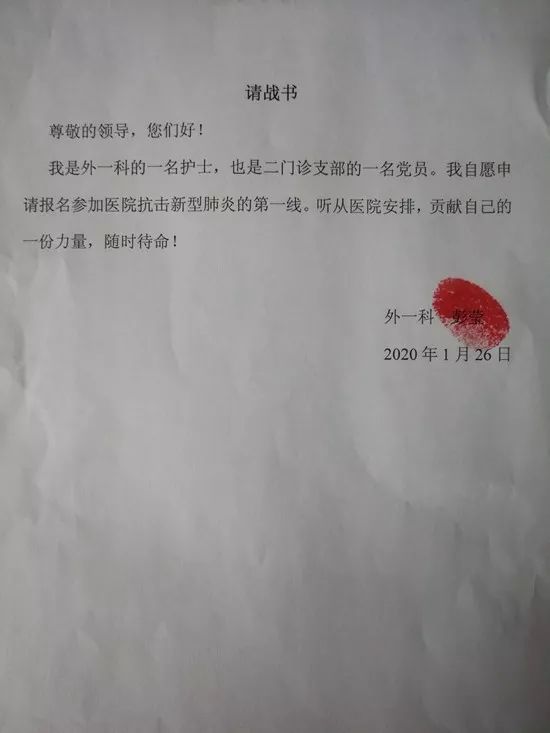 中医院护士党员彭莹的请战书