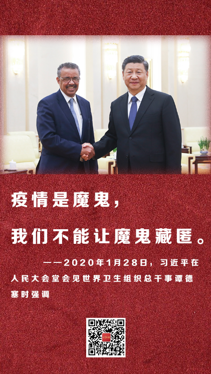 ——2020年1月28日,习近平在人民大会堂会见世界卫生组织总干事谭德塞时强调