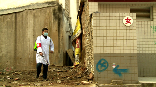杨文是城关镇北关社区的一名普通党员。记者31号见到他的时候,他正背着喷雾器,对社区的公共厕所进行消毒。