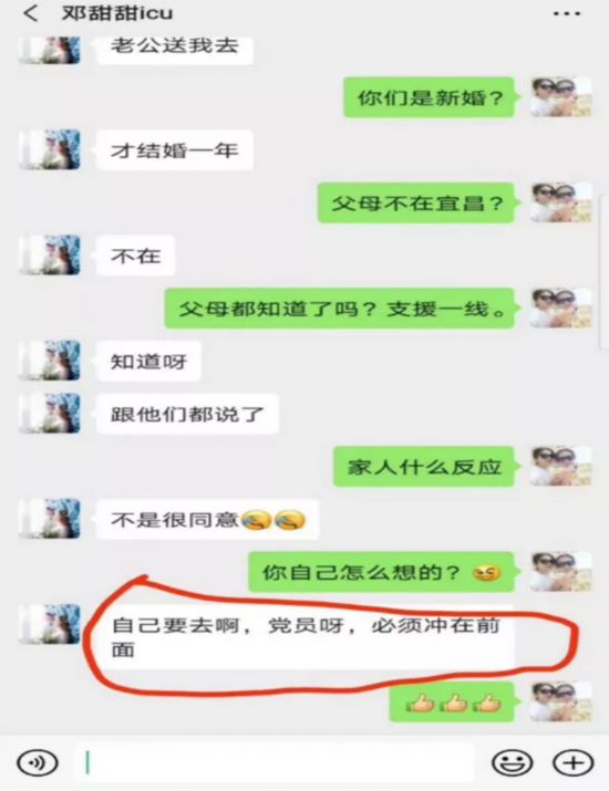 邓甜甜是湖北省宜昌市第二人民医院ICU护士,1月23日,结婚刚一年的她赶赴武汉,到一线支援金银潭医院。尽管家里人并不十分赞成,她仍义无反顾:作为党员,必须冲在前面。