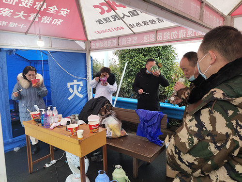 郭春华和同事们在监测点一起吃早餐