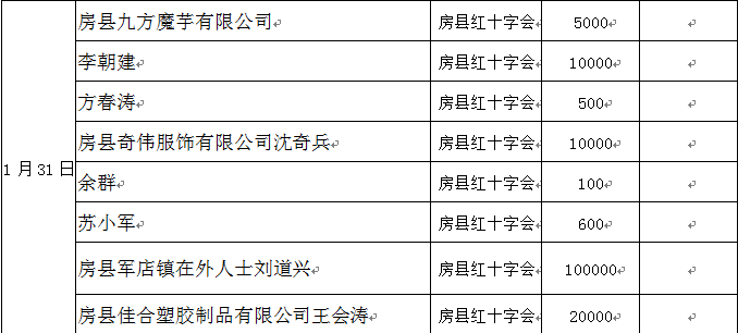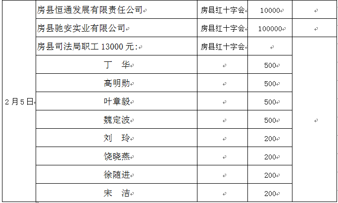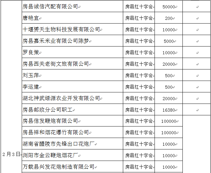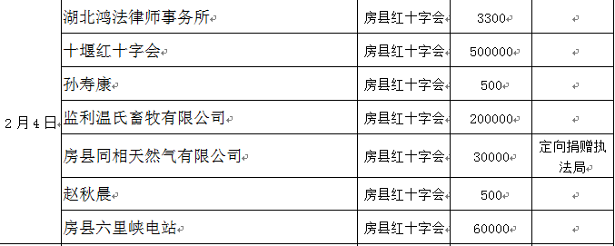 在社会各界的关心支持下,2020年1月29日至2月10日,房县共接受社会各界捐款合计598.968万元(其中房县红十字会账户315.908万元,房县慈善会账户283.06万元),接受社会捐赠物资价值260余万元(物资按现行市场价格估算,部分计价不完全准确)。截至2月10日15:00,因相关拨付兑付手续规范、完善需要一定时间,社会捐款暂未完全支出到位;社会捐赠物资己第一时间分拨支出。为此,特将有关情况公示如下,衷心感谢广大爱心企业、众多爱心人士、各级公益组织、社会各界朋友的慷慨援助,真诚欢迎社会各界跟踪监督。