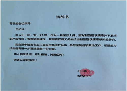 2月7日,根据疫情形势的不断发展,县疫情指挥部决定在红塔卫生院抽调一名身体素质好、业务能力强的护士充实到县级疫情定点医院——广济医院,支持、援助当前疫情工作。院领导在争取几名合适人选的意见后,她第一个递上了请战书,并现场郑重做出承诺,经过慎重商议,她如愿成为我院第一名“援外”医疗成员。