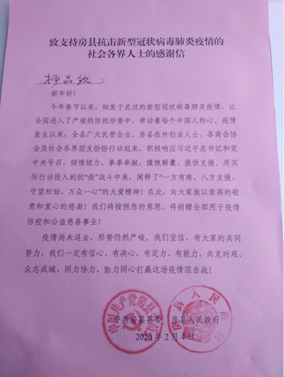带着老人的嘱托,在县老干部局工作人员向房县慈善会说明老人的捐款意图后,在场的所有人员无不为柯老的家国情怀和大公无私的奉献精神所感动,房县慈善会工作人员双手接过这笔沉甸甸的善款,对老人的善举表达了深深地谢意,并表示会遵从老人的意愿,第一时间将这笔善款拨付给窑淮镇界山村委会用于疫情防控,随后为老人出具了收据及感谢信。