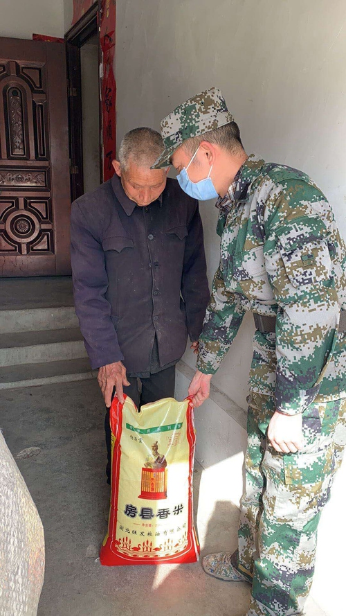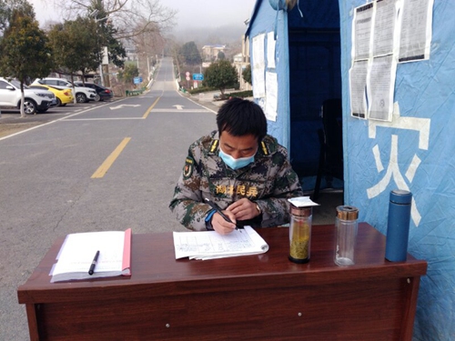 尹吉甫镇中心福利院路口,是由县城到镇的必经之路,也是处于双湾村、玉堤店村、七星沟村三村交接地带,人员流动量大,需要排查人数众多,防控压力大。但在尹吉甫镇中心福利院路口卡口,有一道道靓丽的“迷彩服”,为群众测量体温,检查身份证,劝返闲逛群众。“我是一名退伍军人,也是专武干部,更是共产党员。疫情就是战情,若有战,召必回,战必胜”尹吉甫镇党委委员、武装部长邹斌同志这样说。从1月26日(大年初二)起,邹斌同志便放弃了与家人团聚的美好时光,主动申请返岗,到路口卡口进行防控工作。邹斌同志主要负责排查登记武汉及周边地区返乡人员,跟踪掌握重点人员身体健康情况,疫情防控宣传引导群众及保障七星沟村村民生活必需品供给等相关工作。在统筹协调相关工作的同时,还扮演着“问题调解员”“垃圾清理工”“政策宣传员”,充分发挥了一名军转干部的军人本色。