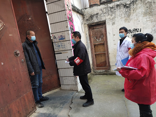 咚咚咚,咚咚咚……”“哪个?”“您好!打扰了,我们是社区网格员,想了解一下你的体温情况。”每天上午九点,城关镇老城社区内,网格员通过微信群电话摸排登记后,为了准确掌握流动人口情况,他们戴上口罩,套上防护服,拿着喇叭,入户摸排返乡人员信息。