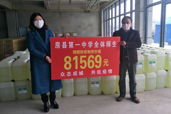 22号,房县一中在职工群发出“勠力同心,共抗疫情”爱心募捐倡议书后,广大师生踊跃捐款,短短两天时间,共募集到81569元,随后立即采购到100桶84消毒液、100桶医用酒精、1.2万个专用口罩和10个电动喷雾器,24号下午,房县一中将防疫物质捐献给房县红十字会,师生们用实际行动积极支持疫情防控。