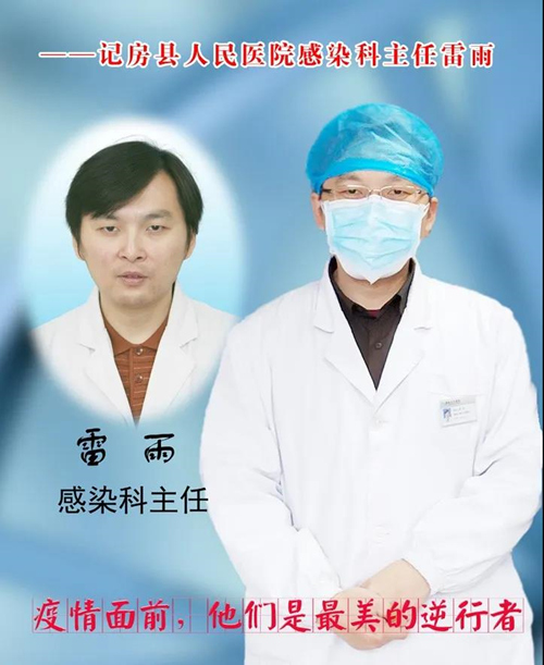 雷雨:男,1976年1月出生房县,1999年本科毕业郧阳医学院临床医学专业,同年就职于房县人民医院。2003年在北京大学第一医院进修并参加SARS疫情战斗,2008年任房县人民医院感染科主任,副主任医师。