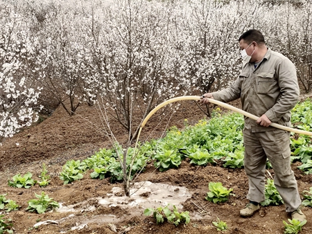 正在樱桃园为树苗浇水的八里村村民王富国戴着口罩说:“现在是非常时期,我在自己园里干点农活,既保护了自己又干了这个活。”