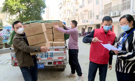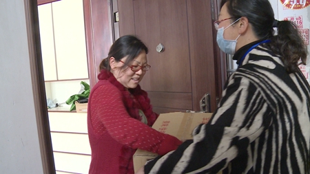 防控点执勤人员把捐赠的冻肉挨家挨户送到居民家