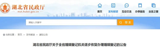 湖北省民政厅关于全省婚姻登记机关逐步恢复办理婚姻登记的公告