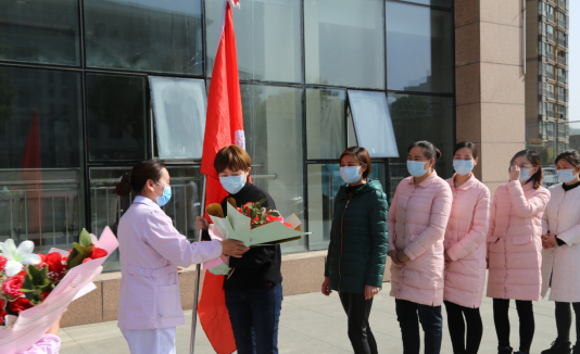 欢迎仪式上,队员所在科室主任、护士长为勇士们敬献了鲜花,队长张娇英同志代表突击队向县卫健局党组、保健院“两委”作了感人肺腑的发言汇报,倾诉了抗疫一线49天的亲身感受和心路历程,闻者为之动容,现场响起了阵阵掌声。