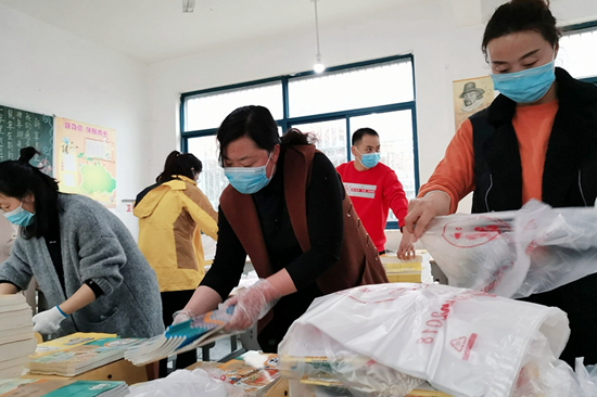 据悉,为保障疫情期间“停课不停学”,该校线上教学已经开展四周了,据很多家长反映,上课期间,学生没有课本,必须每天盯着电子产品翻看教师直播,使用起来非常不便,也对视力有一定影响。了解情况后,该校教导处高度重视,积极进行安排部署,拿出具体方案,做好疫情防控期间学生教材发放工作,经过3天的时间,该校80多名教师和家长志愿者们紧张有序地对各年级的教材进行分类、清点、校对、打包,运送,用最快的速度把全校2947套新教材不落一人的免费送到学生手中,让学生线上学习时手中也有书看。疫情在,爱亦在。在这特殊的时期,该校教师志愿者“送书上门”的举动,使孩子们的学习既达到事半功倍的效果,又传递了学校对学生的沉甸甸的爱,得到家长的一致好评,该校同样也希望这份“热腾腾”的书本能暂时扫除学生当下的阴霾,让拿到新课本的孩子们感受到学校和老师带来的温暖和力量。