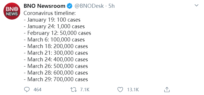 具体时间线如下:1月19日:超过100例;1月24日:超过1000例;2月12日:超过5万例;3月6日:超过10万例;3月18日:超过20万例;3月21日:超过30万例;3月24日:超过40万例;3月26日:超过50万例;3月28日:超过60万例;3月29日:超过70万例。