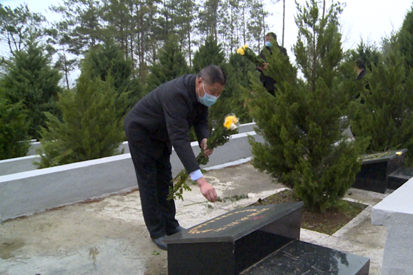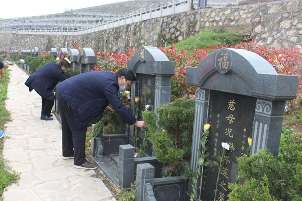 县县民政局和殡仪馆志愿者来到凤凰山公墓,将菊花轻放在一座座墓前,代替家属表达追思之情。