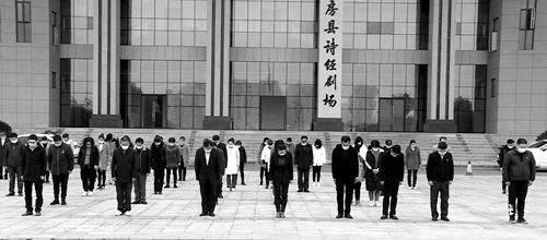 在房县行政中心,工作人员及周围群众来到国旗杆下静立默哀,在国歌声中,五星红旗缓缓升起,在升至杆顶后,缓缓下降至距离旗杆顶端1/3的位置。十点整,防空警报声响起,大家在肃穆的气氛中向新冠肺炎疫情牺牲烈士和逝世同胞默哀3分钟。